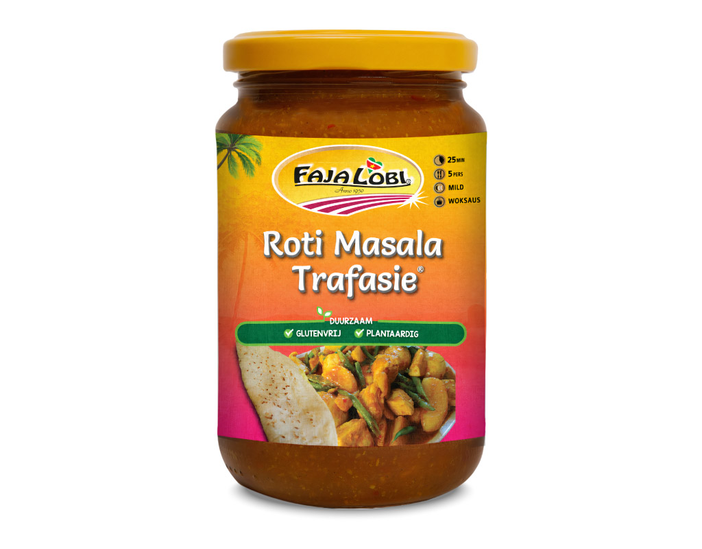 Faja Lobi’s Roti Masala Trafasie is a freshly prepared pan mix specially formulated to make it easy to prepare authentic Surinamese roti dishes. Prepared with fresh herbs and spices and free from artificial additives and gluten. Goes particularly well with Faja Lobi’s Rotis.
